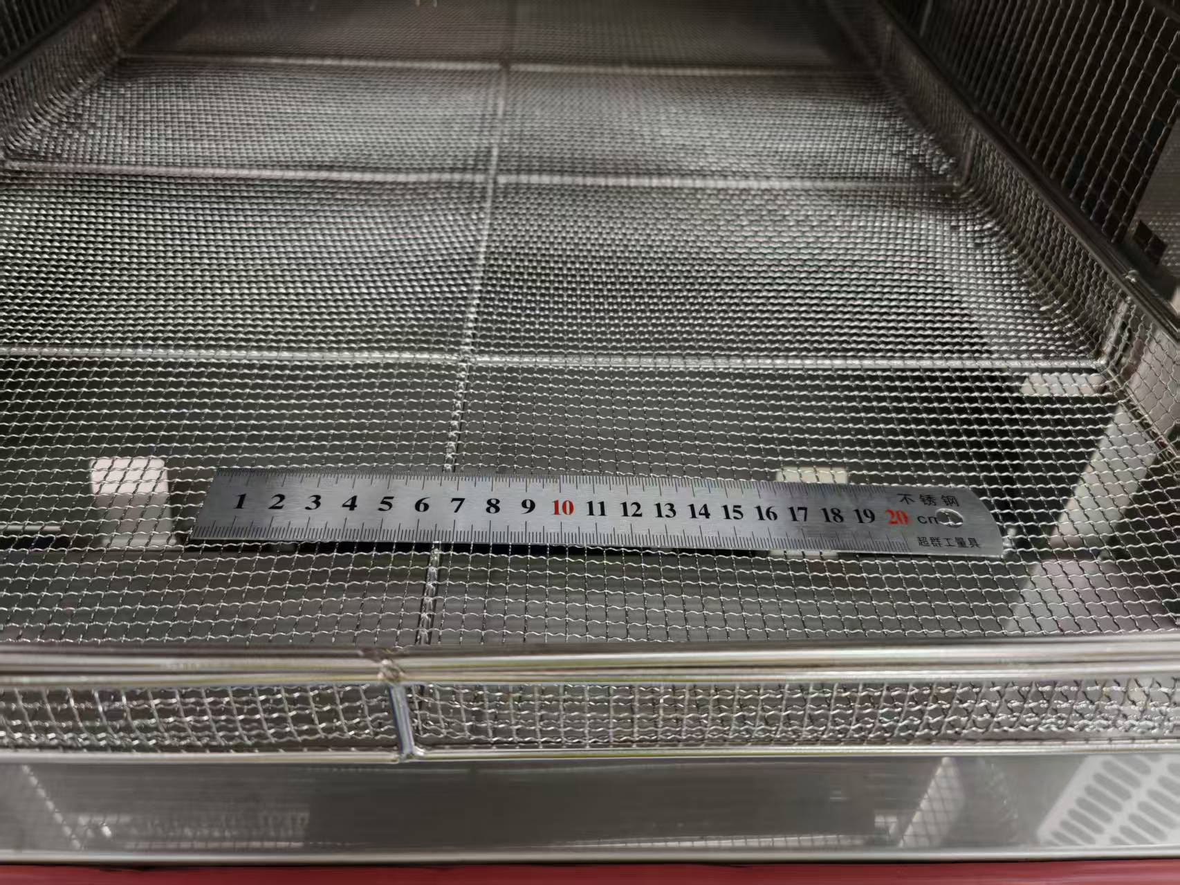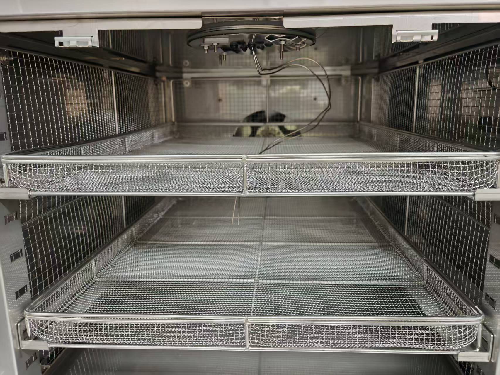 (4) 材料:不锈钢板SUS304,样品篮和试验区底板总承重不小于25公斤,吊篮两侧配备样品篮挂孔间距20mm,可安装不少于5个试样篮,且电动机和滚珠螺杆驱动吊篮上下移动,指示灯显示吊篮位置及移动方向,